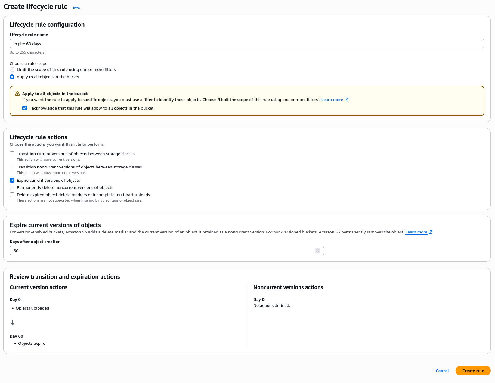 - Select "Apply to all objects in the bucket" and acknowledge the warning